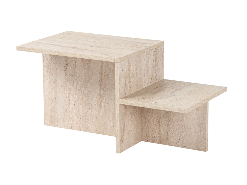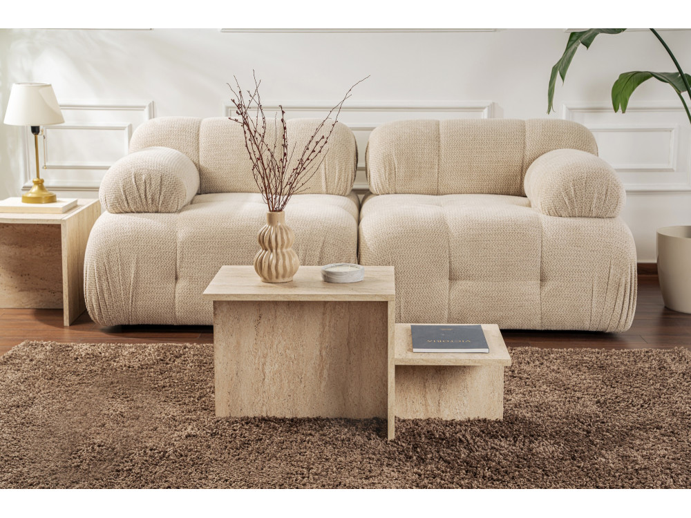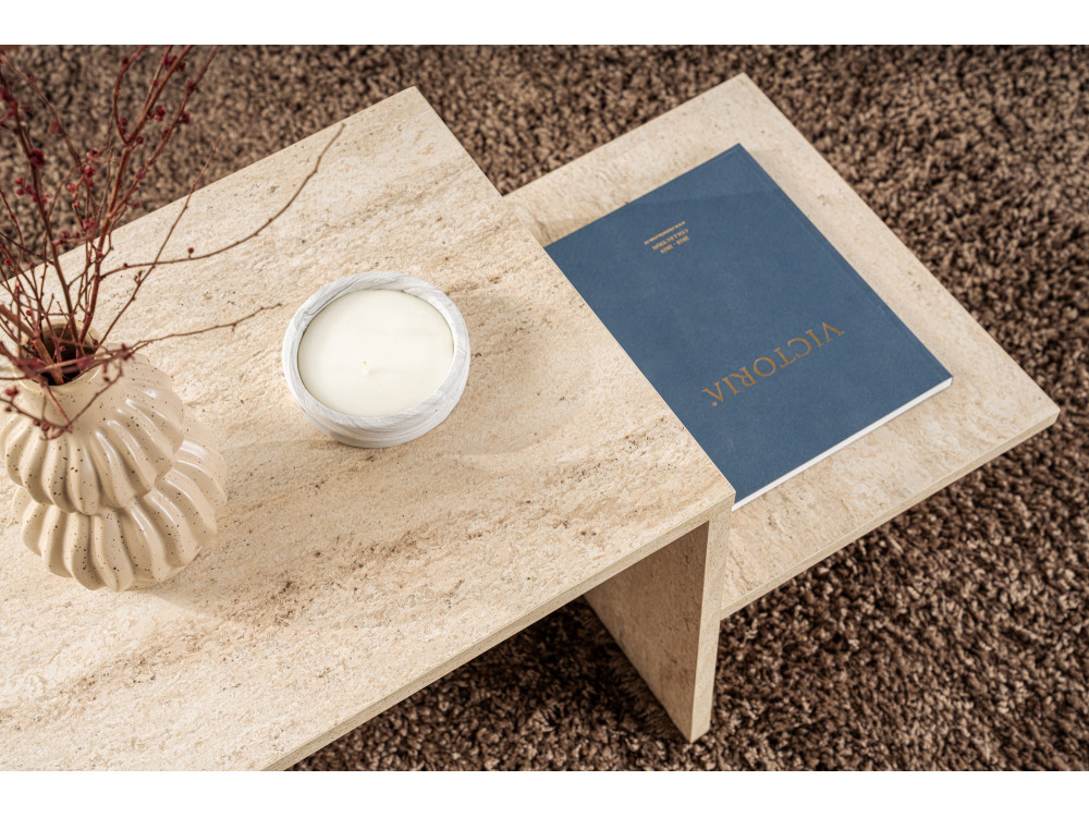 Il modello Harmony fa onore al suo nome proponendo proporzioni equilibrate e una verticalità maggiore rispetto ai tavolini "low-profile" visti in precedenza. La finitura in Travertino su base lignea unisce il calore del materiale strutturale all'estetica prestigiosa della pietra naturale.