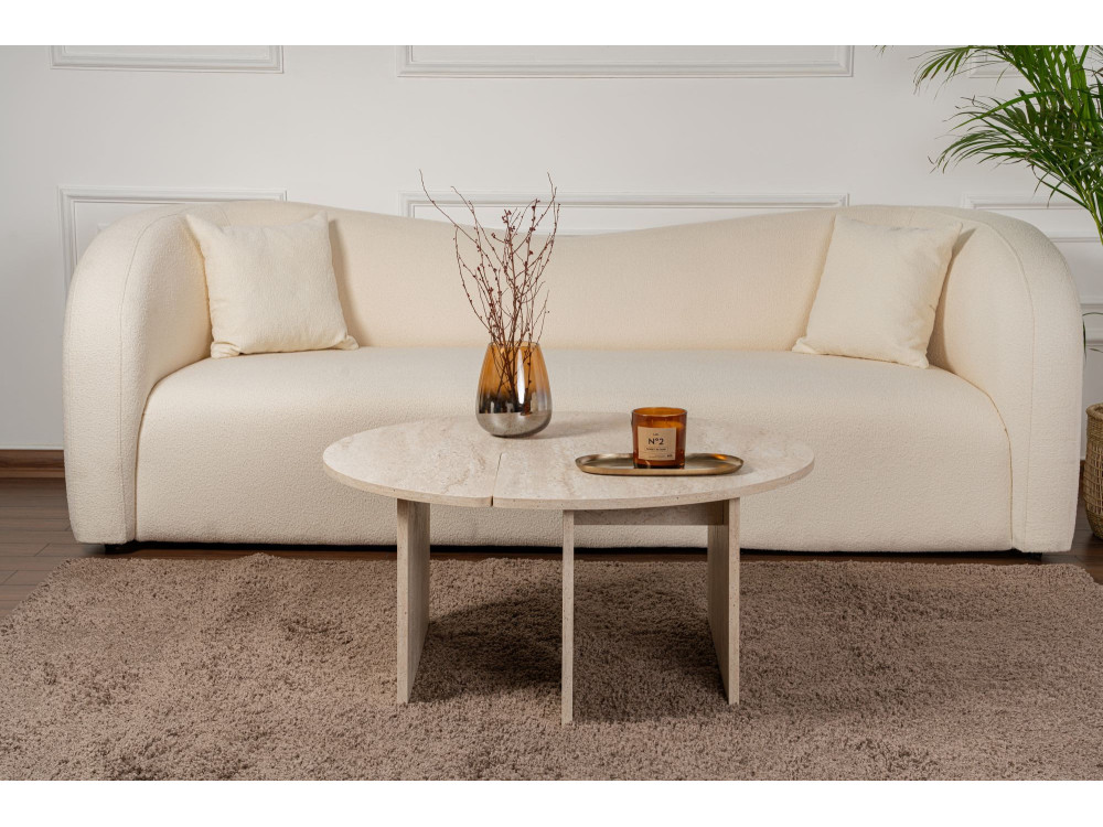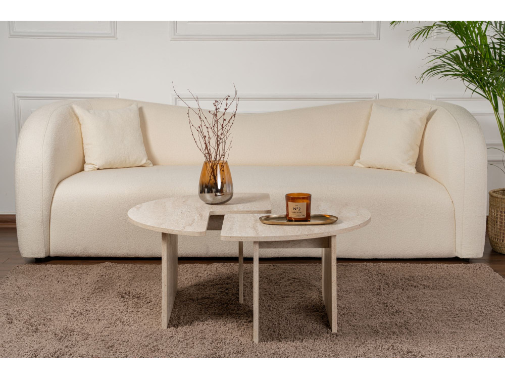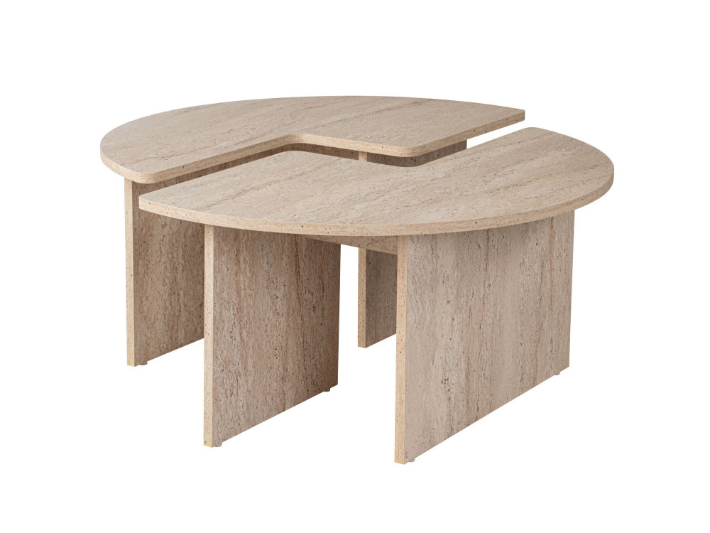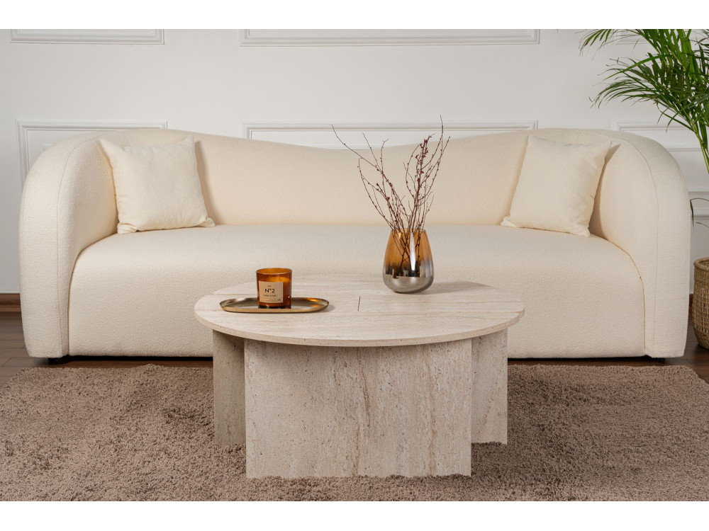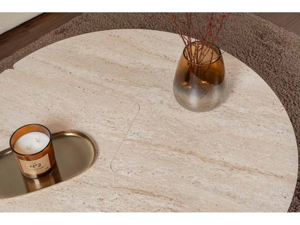 Il modello Moira torna nella sua configurazione geometrica perfetta, ma cambia radicalmente pelle con la finitura Travertino. Se la versione in noce (ART. GHF146585) evocava la tradizione e il calore domestico, questa variante materica trasforma il tavolino in un blocco di design che sembra scolpito nella pietra. È il pezzo ideale per chi desidera un salotto dal respiro internazionale, dove l'estetica minerale incontra la leggerezza strutturale del legno.