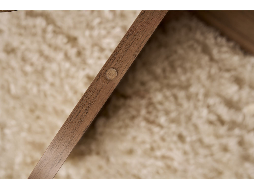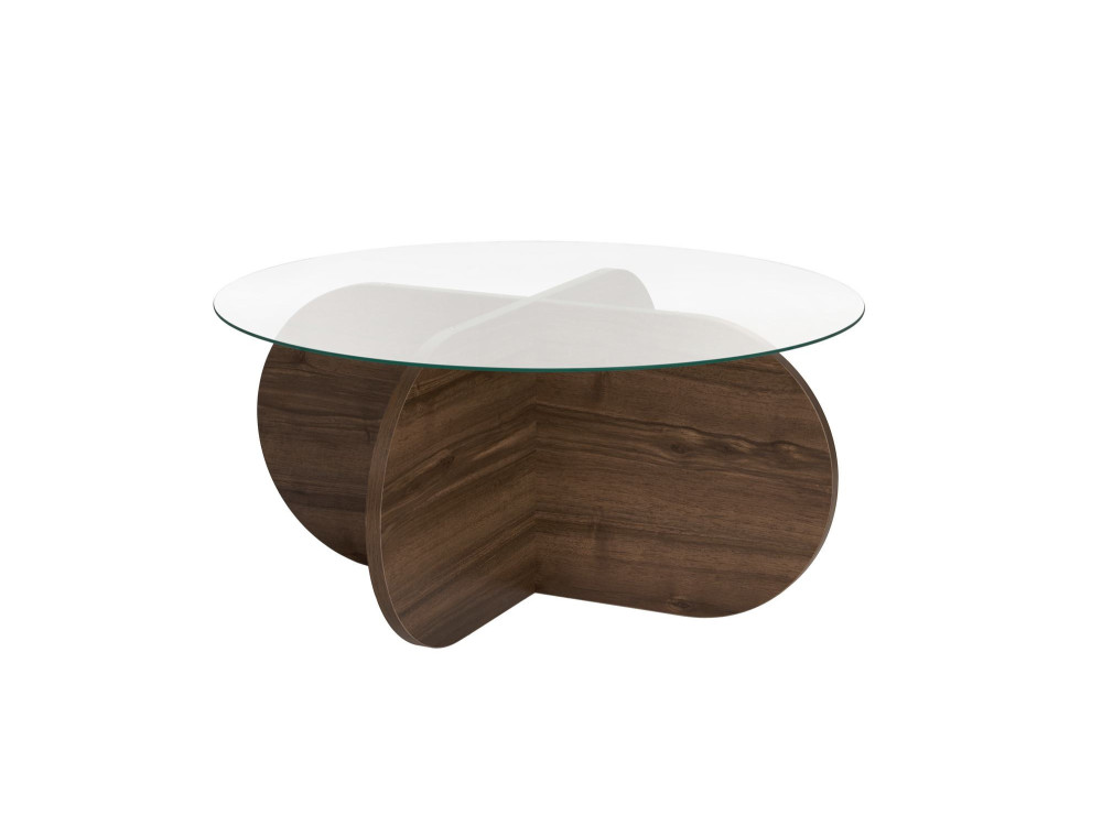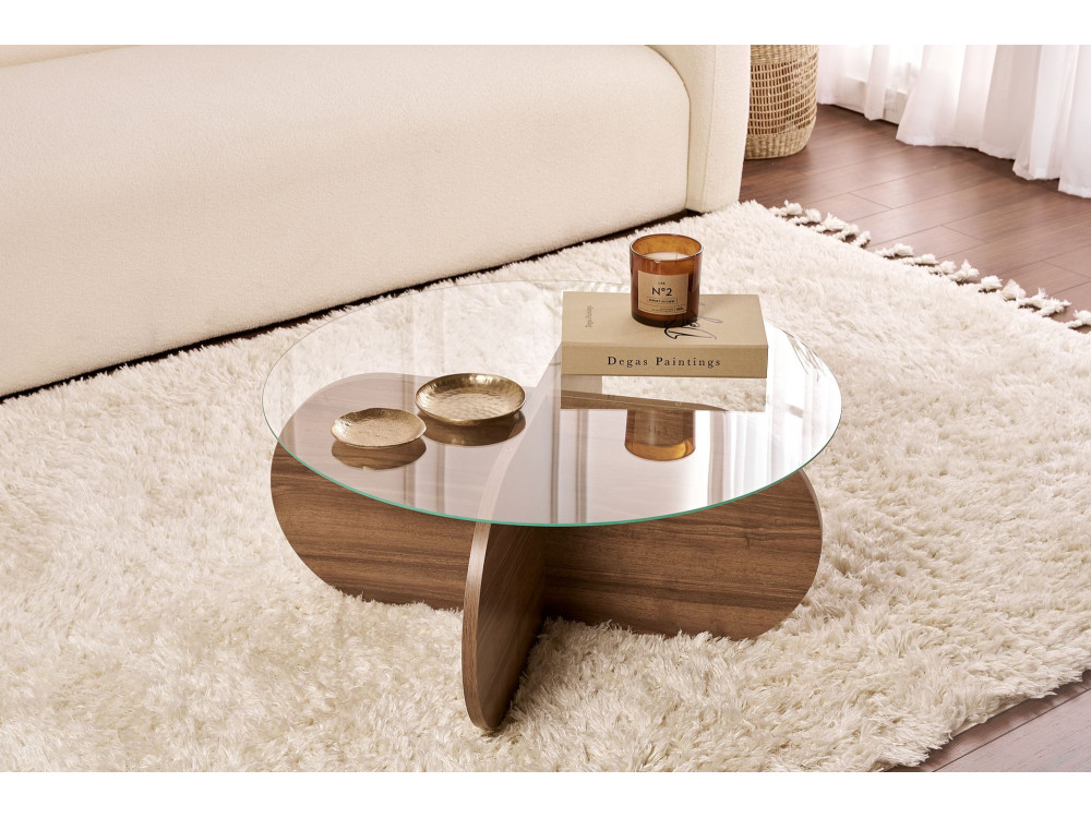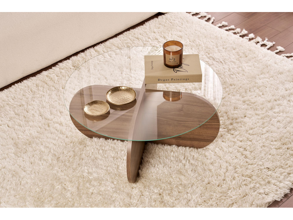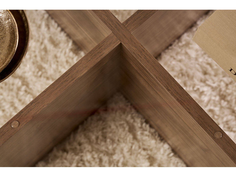 Il tavolo basso "Aeris" (ART. GHF146598) è un pezzo d'arredamento che gioca con la simmetria e la profondità materica. La finitura "Noyer Trasparente" (Noce Trasparente) è particolarmente interessante: si tratta di una tonalità noce che mantiene un'estrema nitidezza nelle venature, lasciando che il disegno naturale del legno sia il vero protagonista senza risultare troppo scuro o coprente.