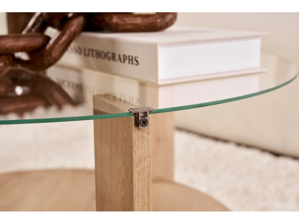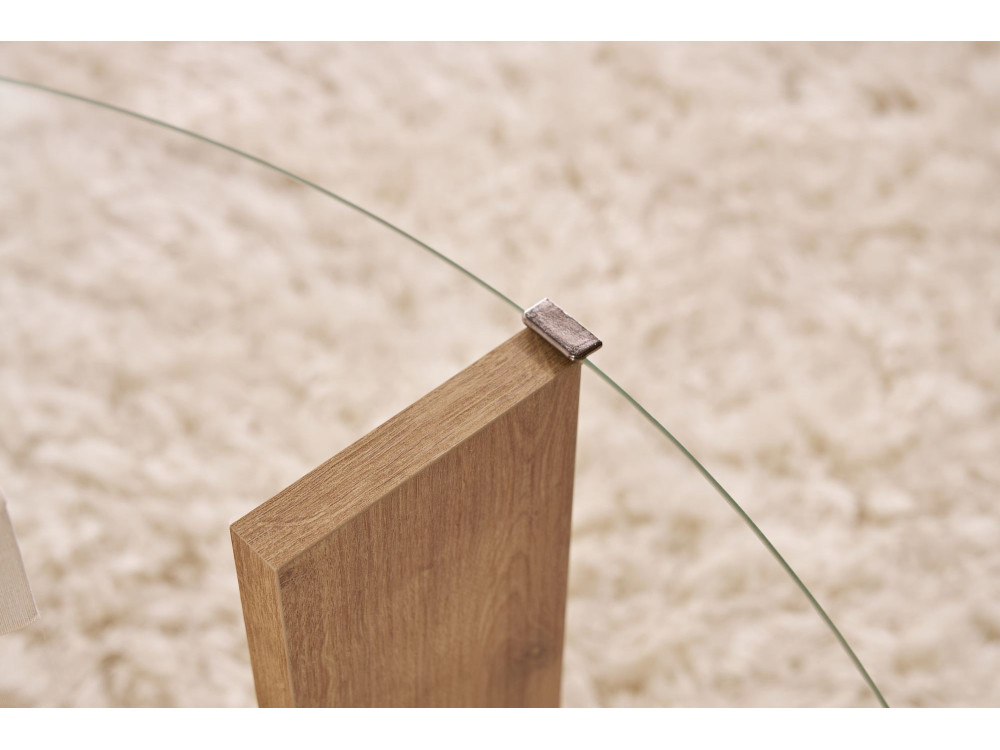 Dettaglio "Trasparente": Questo termine suggerisce solitamente la presenza di un elemento in vetro (forse il piano superiore o un inserto) o una finitura che lascia trasparire completamente la trama del legno, creando un gioco di trasparenze che alleggerisce la struttura.