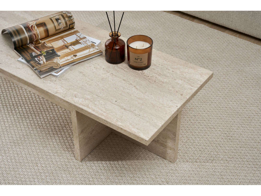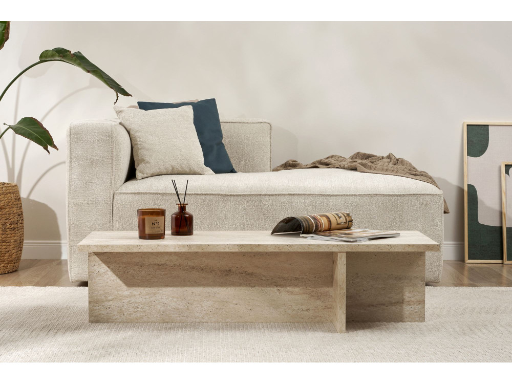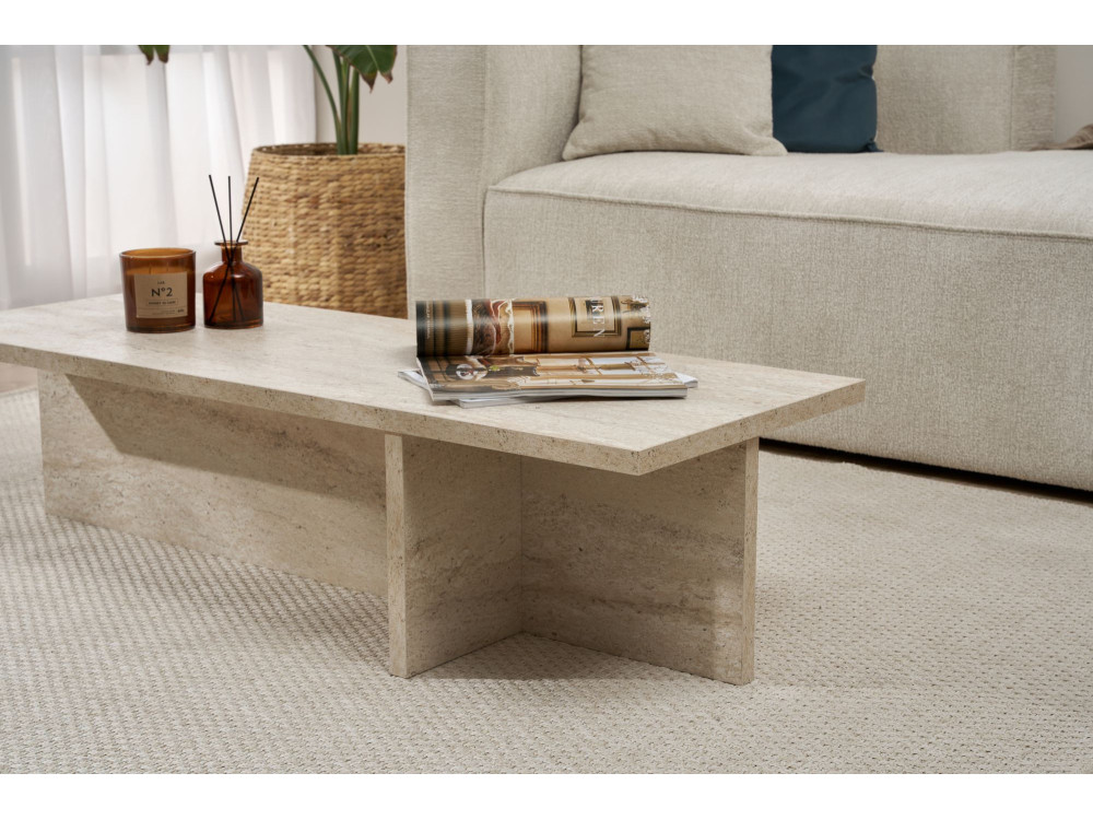 Il tavolino da caffè "Harbor" (ART. GHF146628) è un pezzo d'arredamento dal forte impatto architettonico. La finitura Travertino applicata alla struttura in legno offre l'estetica monumentale della pietra naturale, ma con la praticità di un mobile facile da posizionare.