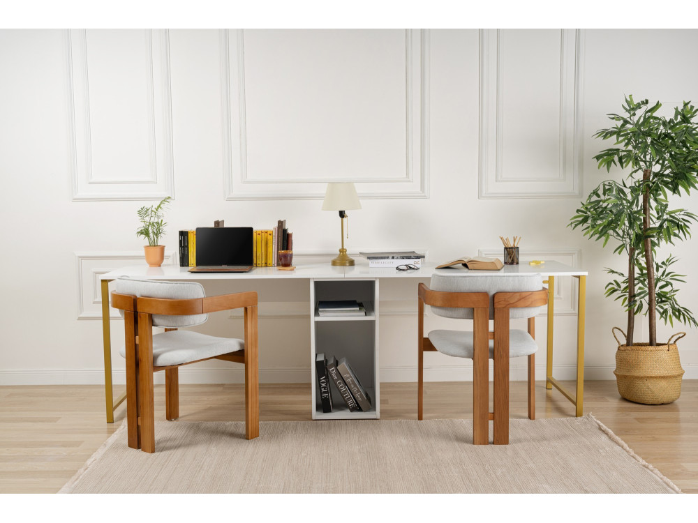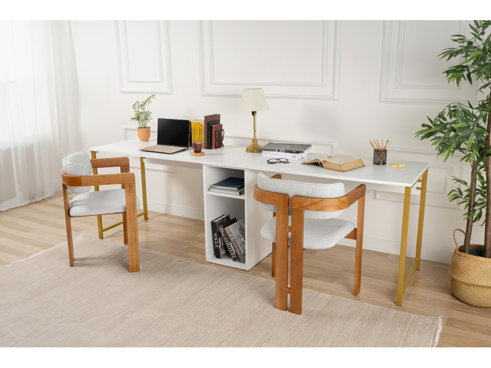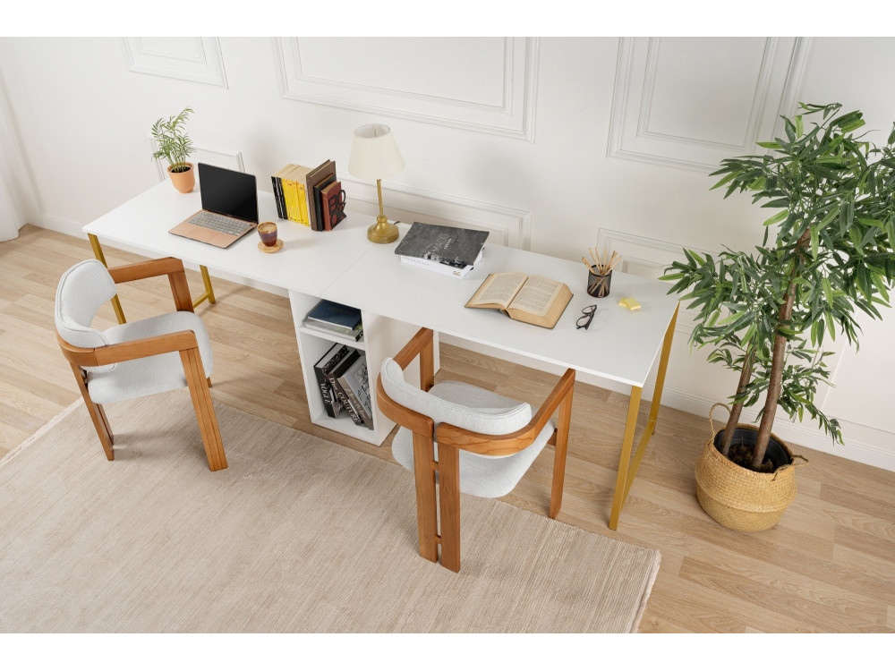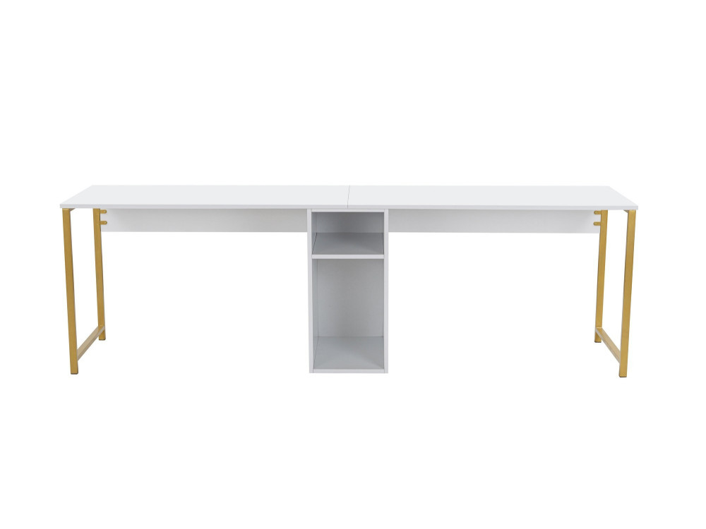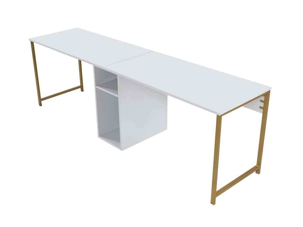 Inauguriamo il nuovo ciclo di analisi con il modello Twin Study Desk nella variante Bianco Oro. Se la versione Travertino/Oro (SR 100) puntava sulla matericità della pietra, questa finitura si sposta verso un'eleganza più eterea e neoclassica. Il bianco ottico incontra la lucentezza del dettaglio dorato, creando una postazione di lavoro che trasmette ordine, pulizia e un tocco di lusso discreto.