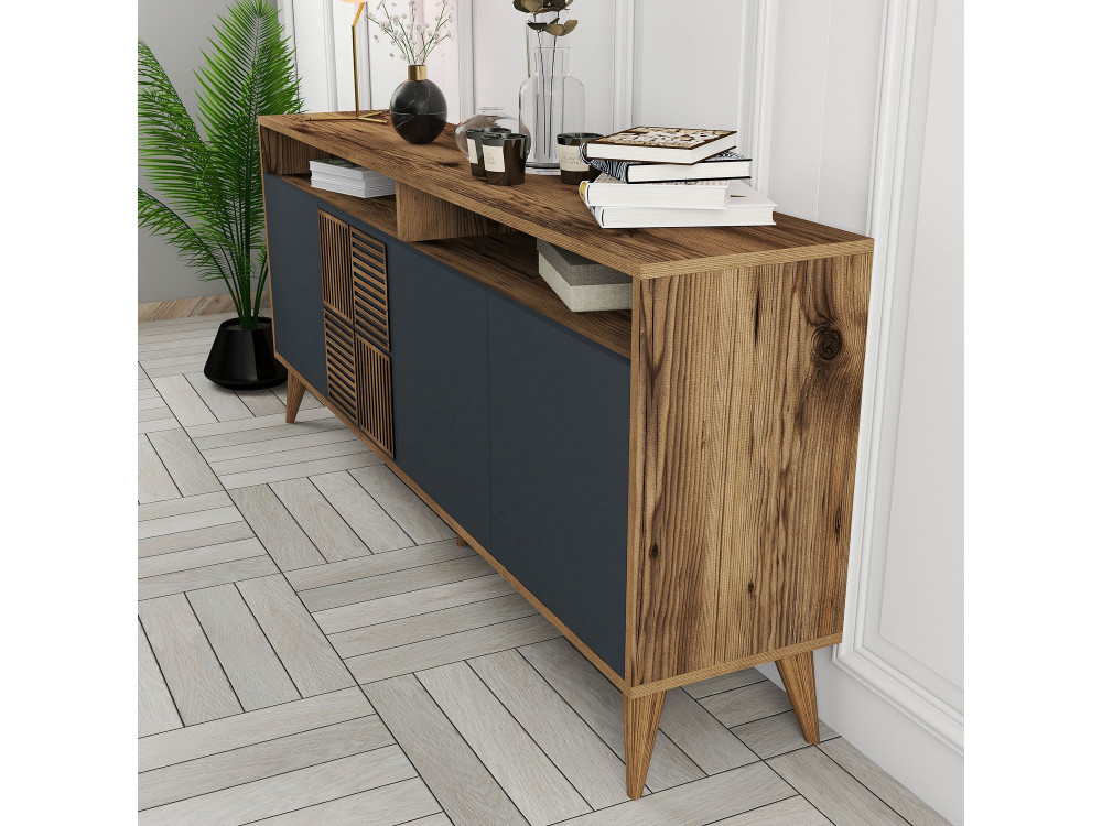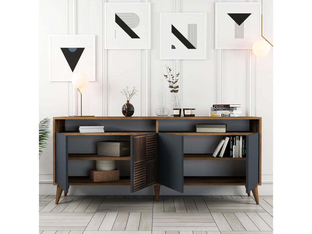 Il buffet "Milano" (ART. GHF146775) incarna perfettamente il nome che porta: un design che evoca l'eleganza metropolitana, rigorosa e sofisticata. La finitura Noyer Antracite (Noce e Antracite) è un accostamento di tendenza che bilancia il calore classico del noce con la modernità tecnica del grigio scuro, creando un mobile dal carattere deciso e cosmopolita.