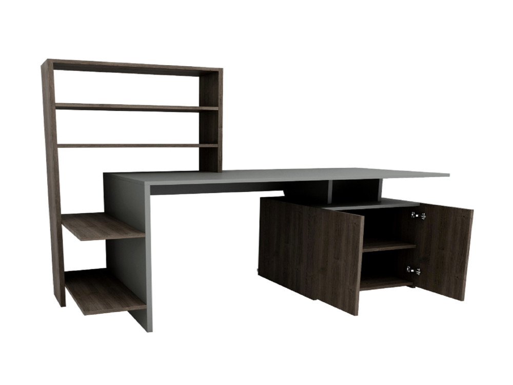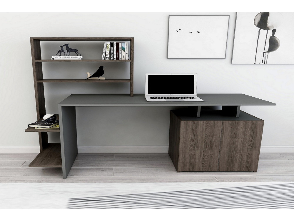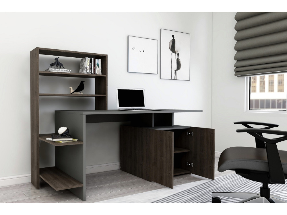 La scrivania Melis è una postazione di lavoro completa che unisce il calore del legno alla modernità cromatica. La finitura Noce Antracite suggerisce un sofisticato contrasto tra le venature classiche del noce e dettagli (o pannellature) in grigio scuro, rendendola un pezzo ideale per un ufficio domestico professionale o una zona studio inserita nel living.