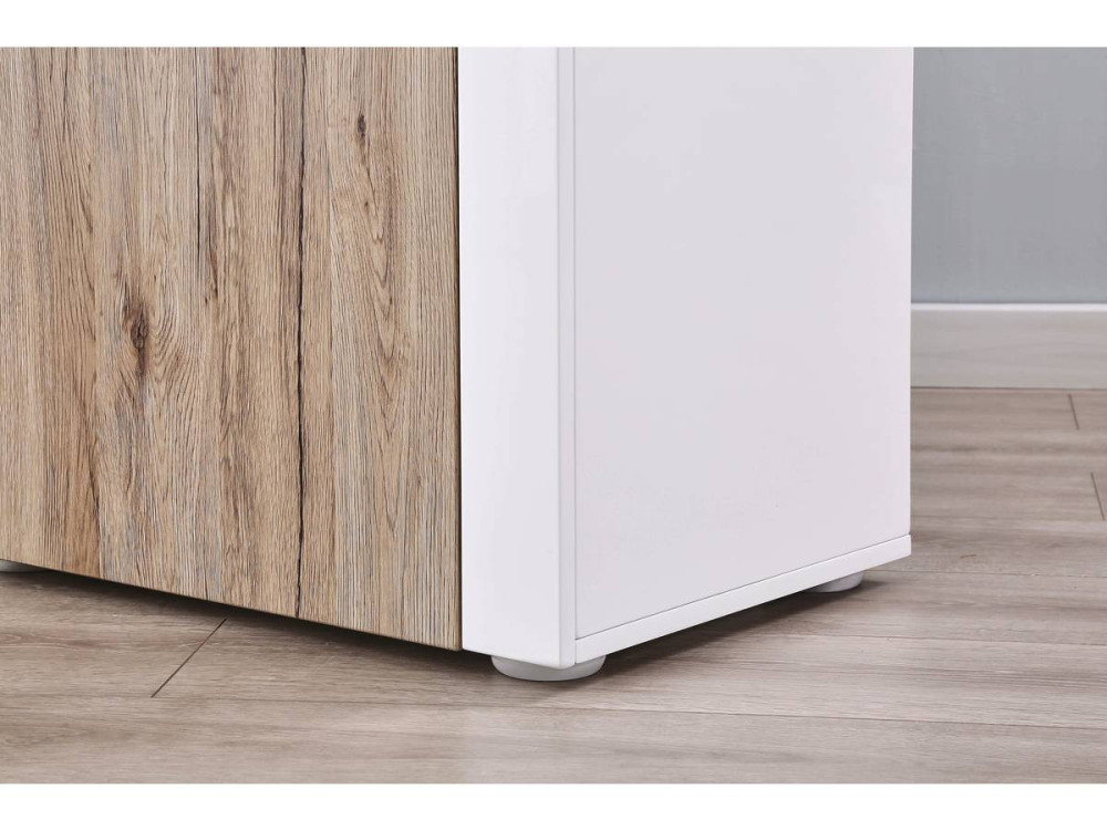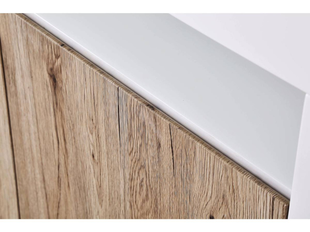 La credenza buffet "Bogota" (ART. GHF99843) è un pezzo d'arredamento di grande impatto, che fonde l'estetica naturale del Rovere con la modernità hi-tech del Bianco laccato e dell'illuminazione a LED.