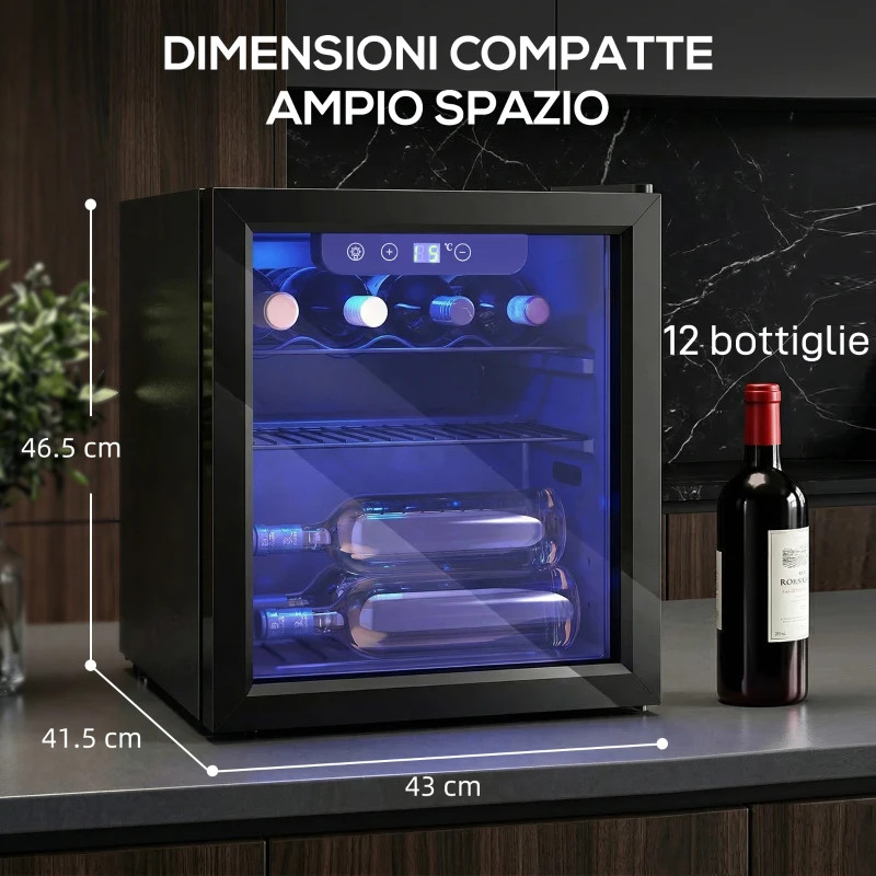 Proteggi e valorizza la tua collezione vinicola con questa cantinetta refrigerata da 36 litri, progettata per conservare fino a 12 bottiglie in condizioni termiche impeccabili. Grazie al sistema di controllo della temperatura regolabile in un range che va dai 4°C ai 16°C, questo elettrodomestico si rivela estremamente versatile, permettendoti di impostare il grado di freschezza ideale sia per i vini bianchi e le bollicine, sia per i rossi che richiedono una temperatura di conservazione più mite. Il design minimalista in nero opaco la rende un elemento d'arredo discreto e sofisticato per la tua cucina o il tuo angolo bar.