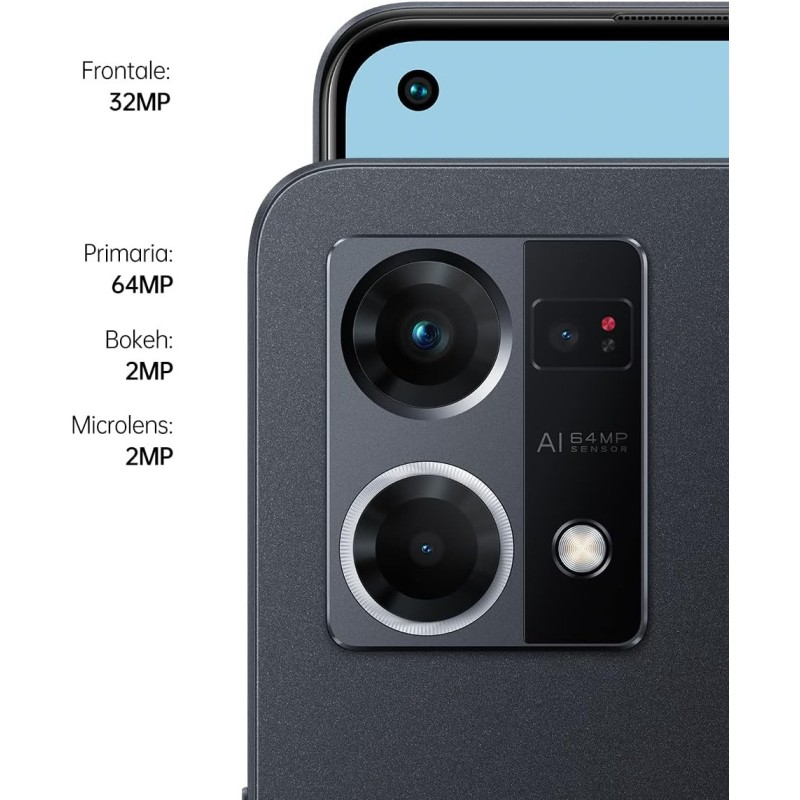 Con l'articolo SMT8729, torniamo a uno dei classici più amati per il suo equilibrio estetico e le sue capacità fotografiche uniche. L'Oppo Reno 7 4G è lo smartphone che ha introdotto il concetto di "fotografia microscopica" in un corpo ultra-sottile. La finitura Cosmic Black offre un nero profondo ispirato alla vastità dello spazio, con una texture setosa al tatto che brilla discretamente sotto la luce diretta, mantenendo un profilo sobrio e altamente professionale.