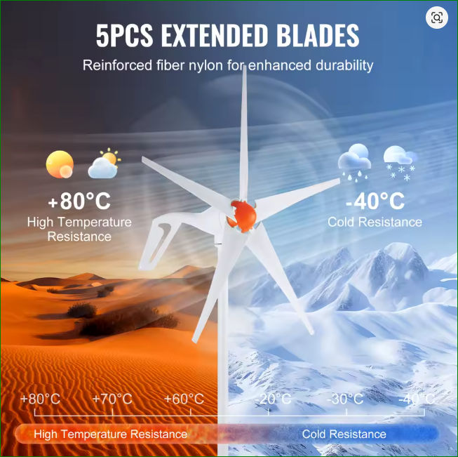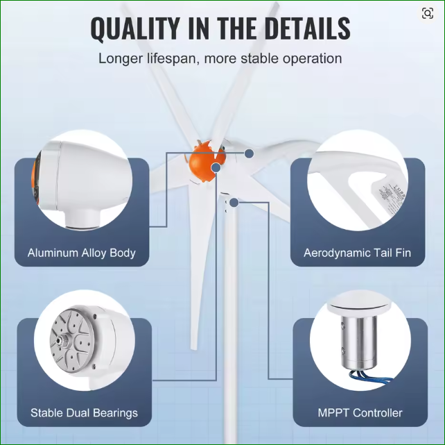Costruito con materiali di alta qualità resistenti alla corrosione e agli agenti atmosferici, il generatore SucceBuy è progettato per durare nel tempo. Le pale sono ottimizzate aerodinamicamente per garantire un avvio rapido anche con brezze leggere e un funzionamento silenzioso.