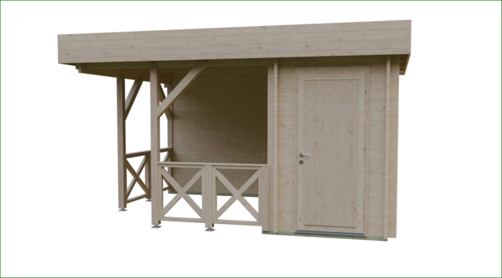 Questa configurazione è la preferita dai nostri clienti che amano il barbecue: la zona chiusa permette di tenere al sicuro carbonella e accessori, mentre la veranda offre il riparo perfetto per cucinare all'aperto anche in caso di pioggia leggera. Per il tetto piano, consigliamo vivamente l'applicazione di una membrana EPDM per una protezione a lunghissimo termine.