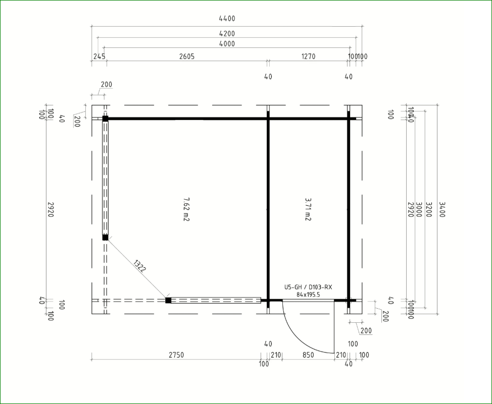 Area Veranda (3,71 m²): Uno spazio aperto delimitato da pali rinforzati da 9x9 cm e un parapetto stabile con Croci di Sant'Andrea, ideale per il tempo libero.