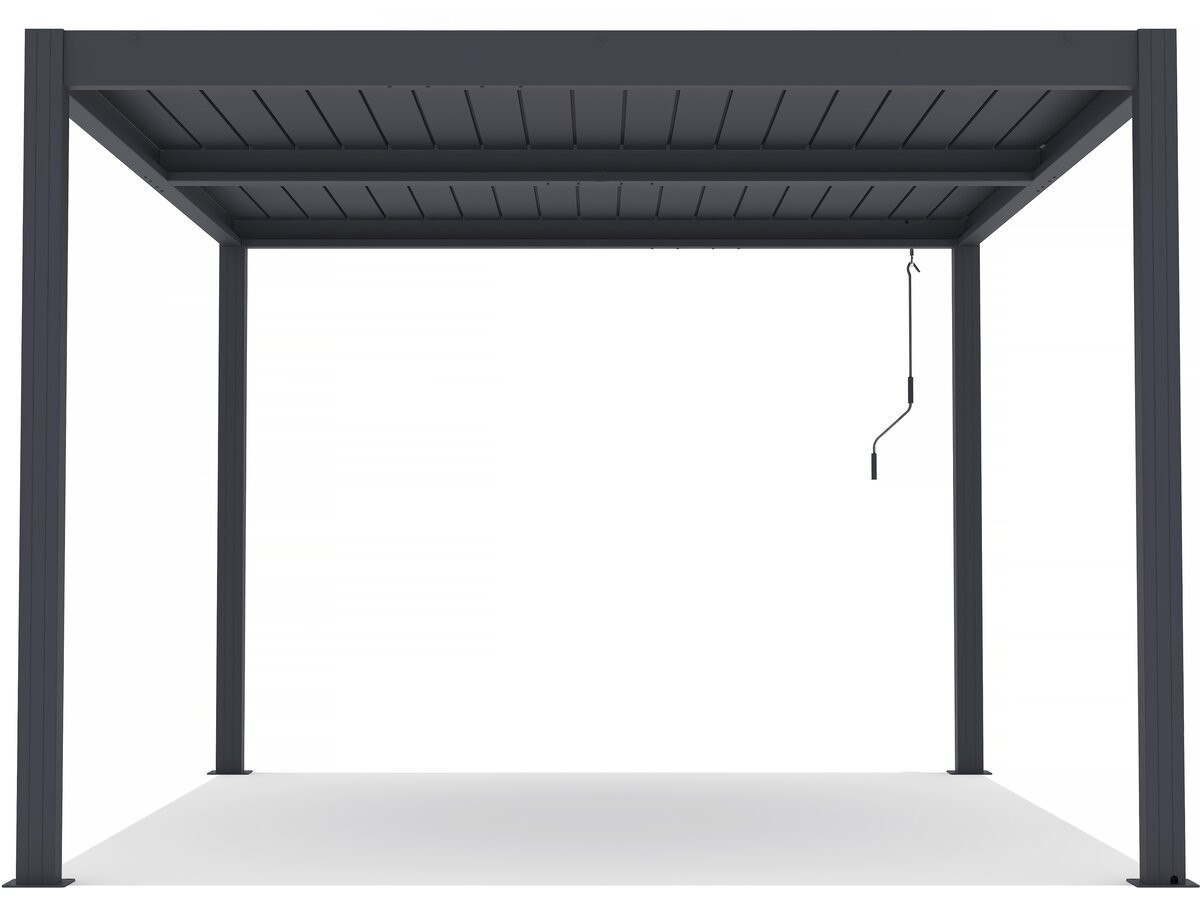 Realizzata interamente in alluminio con finitura grigio antracite, la pergola è progettata per resistere agli agenti atmosferici senza necessità di manutenzione costante. Il sistema di doghe orientabili tramite manovella ti consente di proteggerti dal sole estivo o di chiudere completamente la copertura in caso di pioggia, convogliando l'acqua attraverso l'innovativo sistema di drenaggio integrato nei pali portanti.