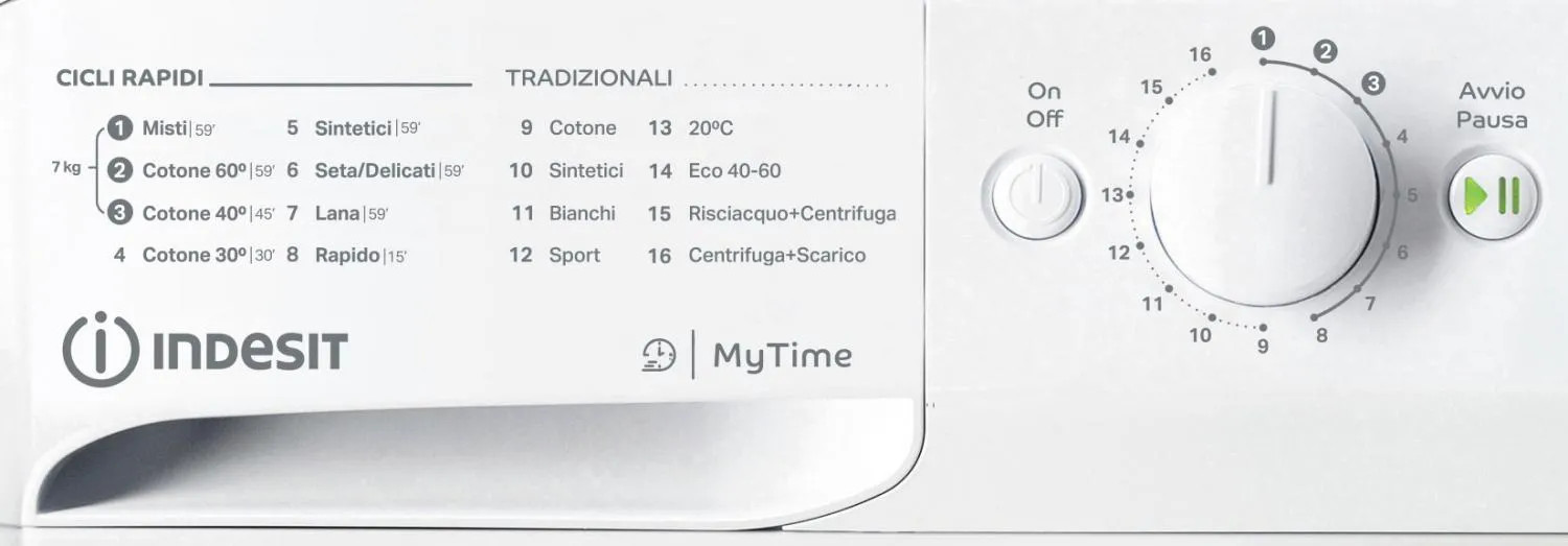 Tecnologia MyTime: L'unica lavatrice con ben 3 cicli di lavaggio a pieno carico rapidi (sotto i 59 minuti), ideale per chi ha poco tempo ma non vuole rinunciare a un bucato perfetto.