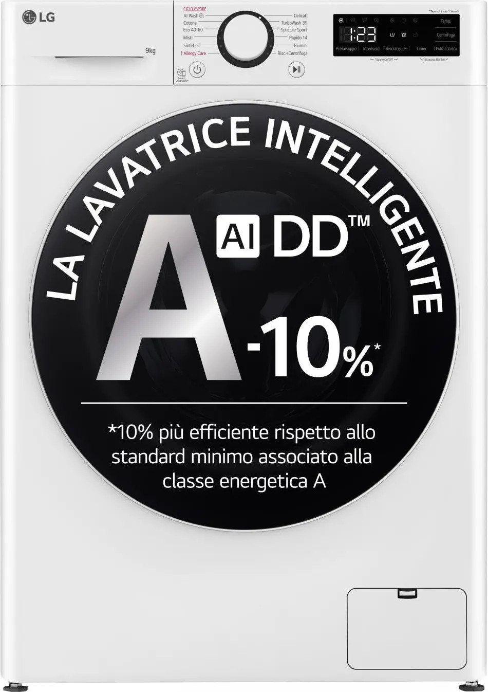Intelligenza Artificiale AI DD™: Rileva il peso e riconosce la tipologia di tessuti all'interno del cestello, scegliendo autonomamente tra oltre 20.000 combinazioni di lavaggio per proteggere i tuoi capi del 18% in più.