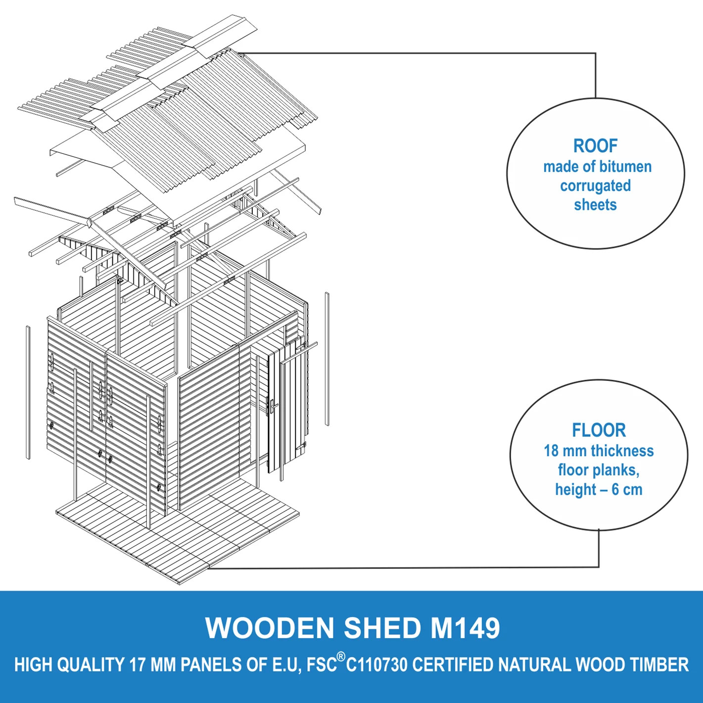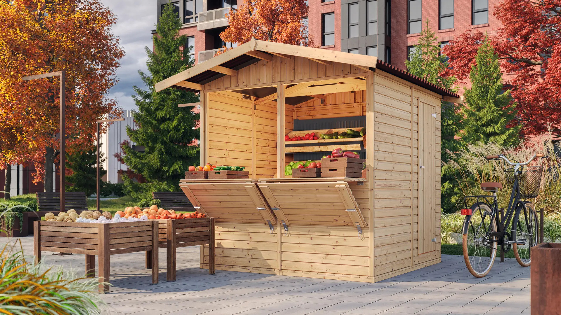 Design funzionale: ogni chiosco è dotato di pavimento in legno e tetto in pannello bituminoso ondulato. Il banco vendita si chiude dall'interno e la porta può essere posizionata dove preferite.