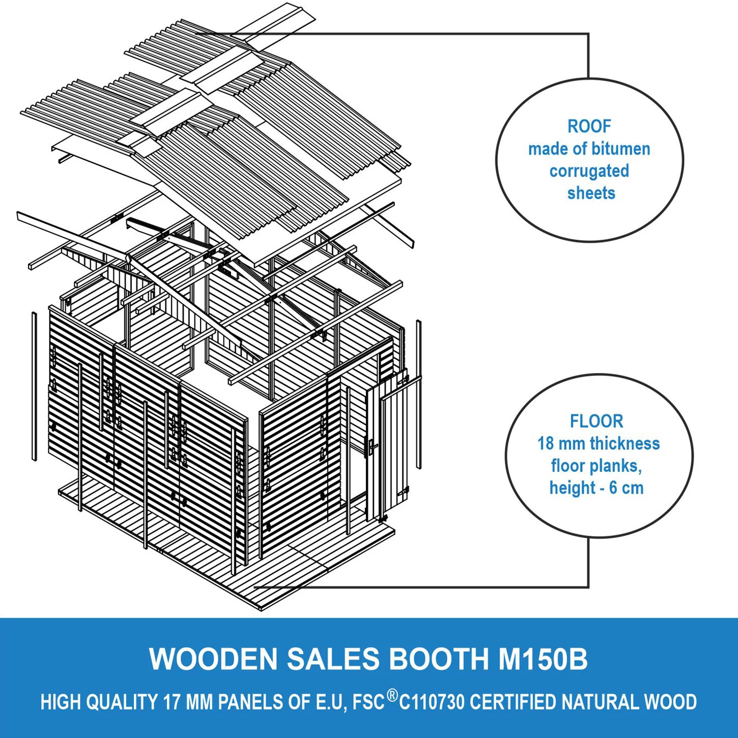 Design funzionale: ogni chiosco è dotato di pavimento in legno e tetto in pannello bituminoso ondulato. Il banco vendita si chiude dall'interno e la porta può essere posizionata dove preferite.