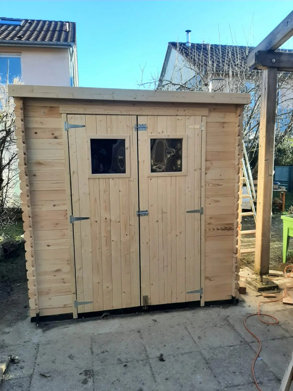 Casetta in legno robusta: il montaggio della casetta ad incastro richiede un po' più di tempo, ma conferisce alla casetta da giardino maggiore resistenza e durata. Montare una nuova casetta sarà un vero piacere per ogni appassionato del fai da te. Grazie alle ampie porte, è facile posizionare oggetti più grandi all'interno della casetta e le finestre in plexiglass forniscono luce naturale.