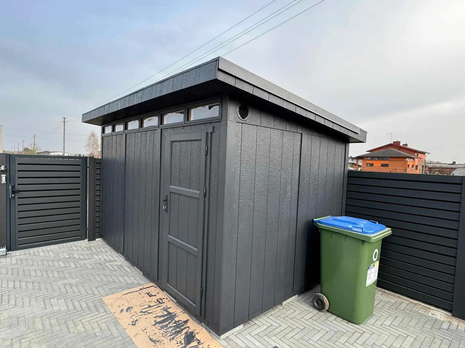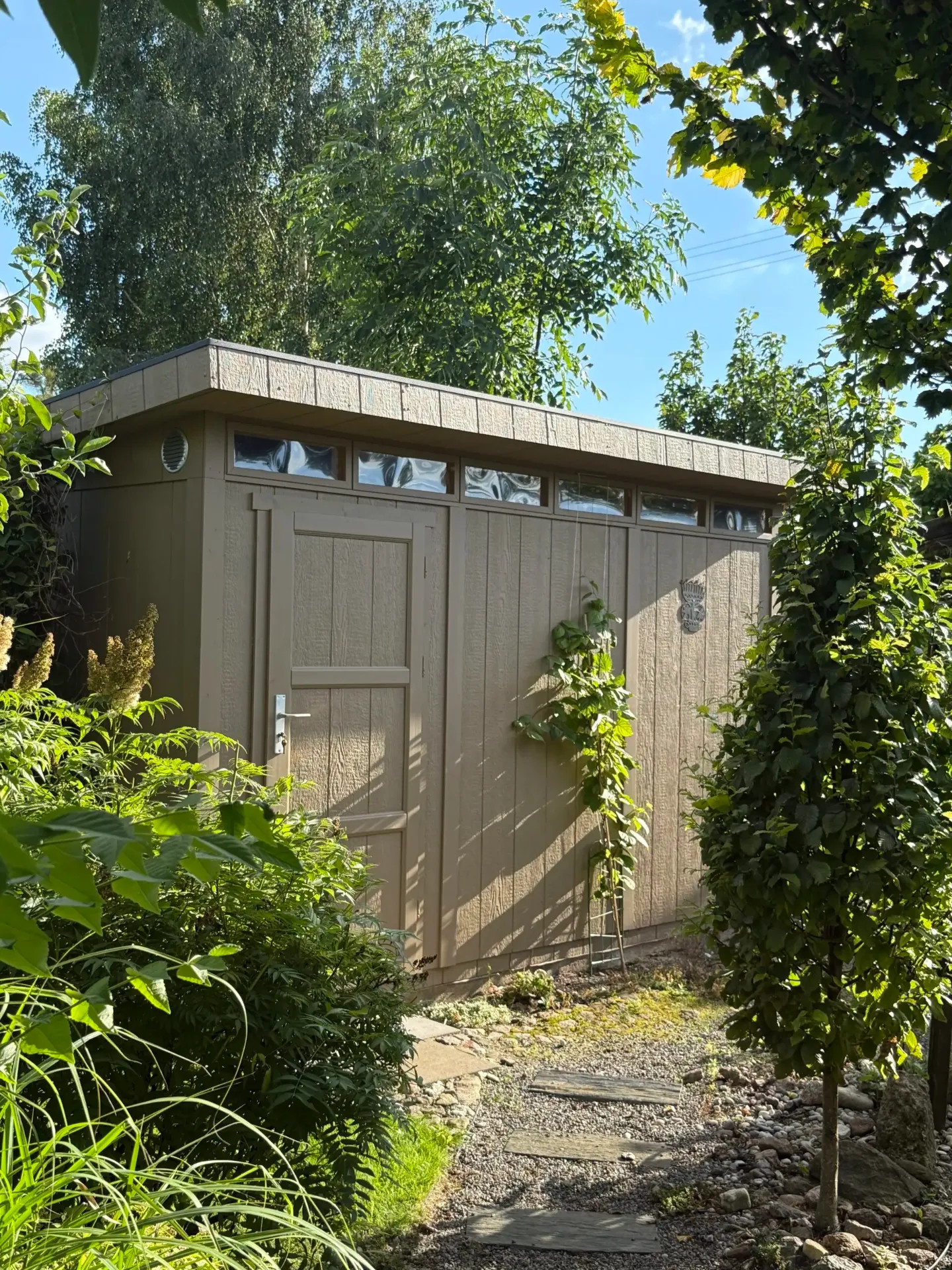 Casetta da giardino moderna e minimalista LP® SmartSide® – ideale per riporre in modo ordinato e pratico attrezzi da giardino, biciclette, piccoli utensili o giochi per bambini.