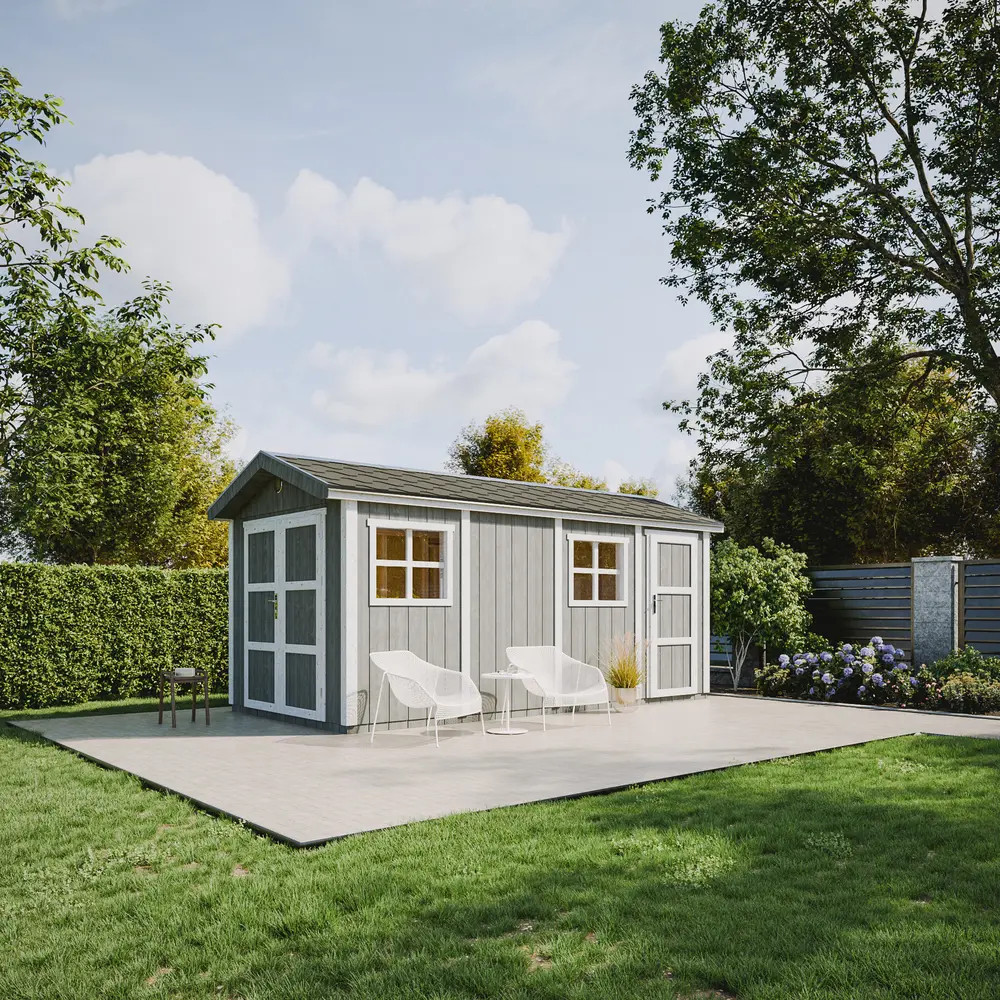 Pacchetto completo: La casetta viene fornita con pavimentazione LP® ProStruct® e tegole bituminose grigie. Le griglie di ventilazione integrate assicurano una buona circolazione dell'aria all'interno.