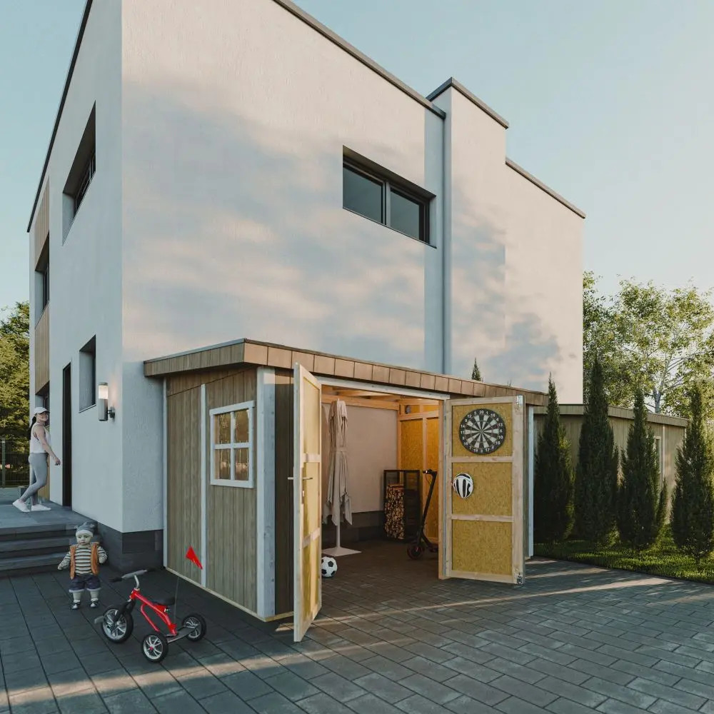 Struttura solida a pannelli: Le pareti sono realizzate con un telaio in legno da 60×60 mm e pannelli LP® SmartSide® da 10 mm con rivestimento primerizzato – per garantire durata e stabilità anche in condizioni meteo difficili.