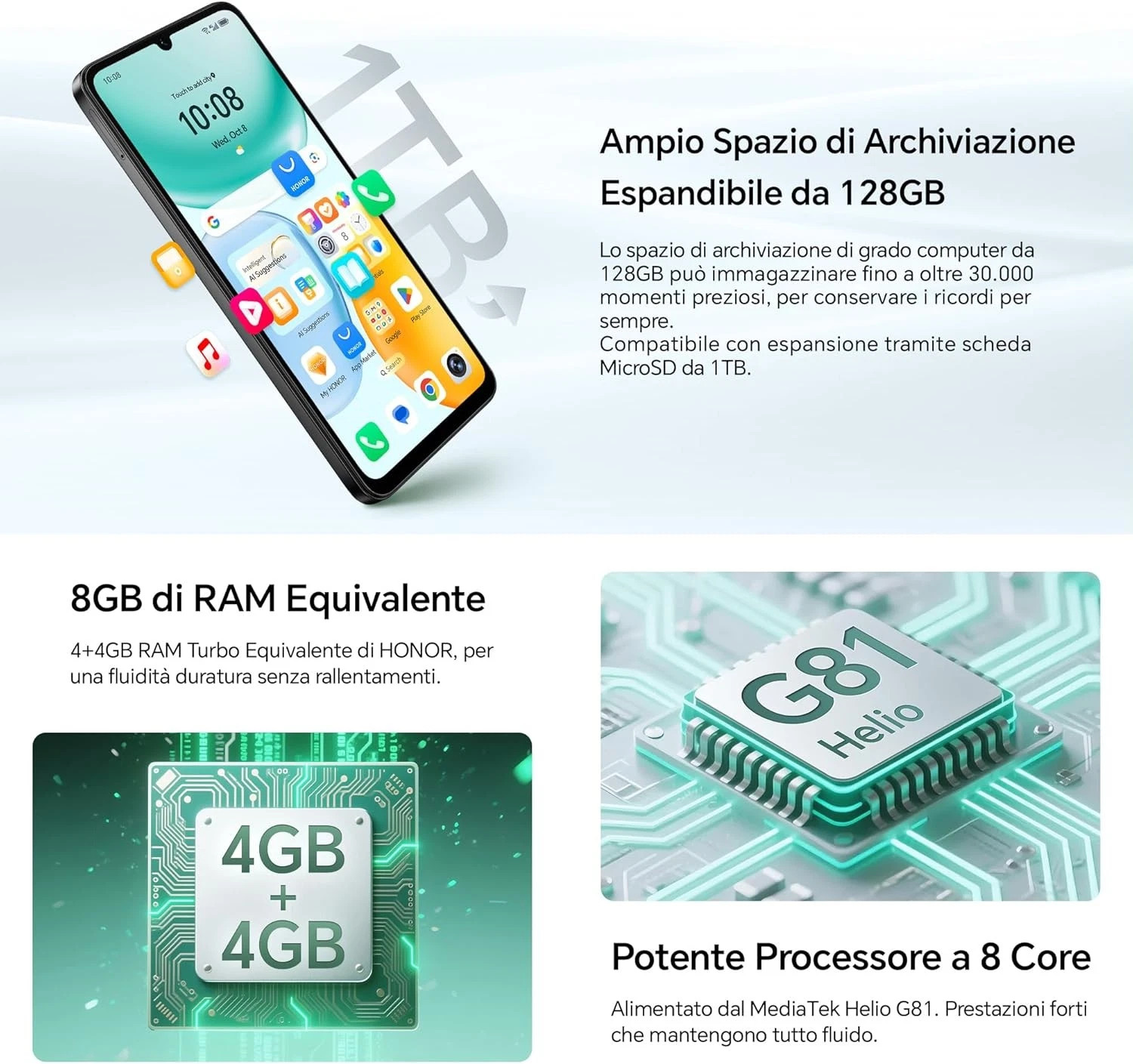 Tecnologia RAM Turbo (4+4GB): Grazie al sistema di espansione dinamica, ai 4GB di RAM fisica se ne aggiungono altri 4GB recuperati dalla memoria ROM, garantendo un'esperienza d'uso fluida anche con più app aperte contemporaneamente.