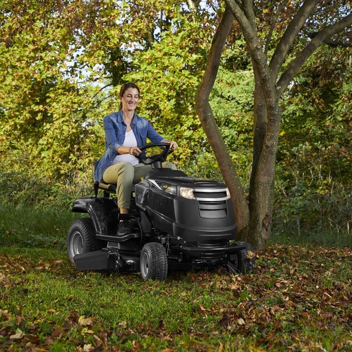 Sistema di Taglio Versatile: Larghezza di taglio da 98 cm con doppia lama, scarico laterale per erba alta e funzione mulching integrata per fertilizzare il terreno naturalmente.